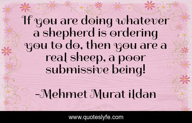 This page presents the quote "If you are doing whatever a shepherd is ordering you to do, then you are a real sheep, a poor submissive being!". Author of this quote is Mehmet Murat ildan. This quote is about sheep, shepherds, submissive, shepherd, murat-ildan, submissiveness, sheep-mentality, turkish-literature,.