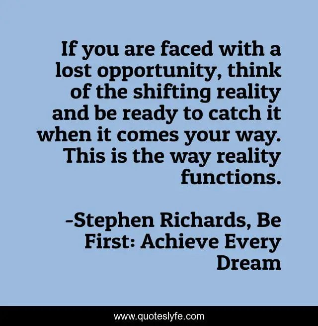 This page presents the quote "If you are faced with a lost opportunity, think of the shifting reality and be ready to catch it when it comes your way. This is the way reality functions.". Author of this quote is Stephen Richards, Be First: Achieve Every Dream. This quote is about mind-body-spirit, confidence, money, wealth, self-help-book, wealth-creation, law-of-attraction, motivational, positive-thinking,.