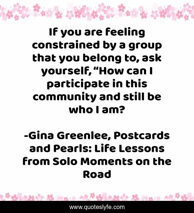 This page presents the quote "If you are feeling constrained by a group that you belong to, ask yourself, “How can I participate in this community and still be who I am?". Author of this quote is Gina Greenlee, Postcards and Pearls: Life Lessons from Solo Moments on the Road. This quote is about be-you, be-who-you-want-to-be, be-yourself, be-yourself-inspirational, authenticity, authentic-living, authentic-self,.