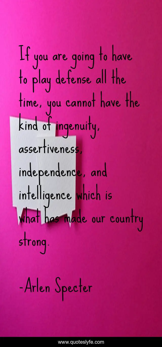 This page presents the quote "If you are going to have to play defense all the time, you cannot have the kind of ingenuity, assertiveness, independence, and intelligence which is what has made our country strong.". Author of this quote is Arlen Specter. This quote is about strong, independence, time,.