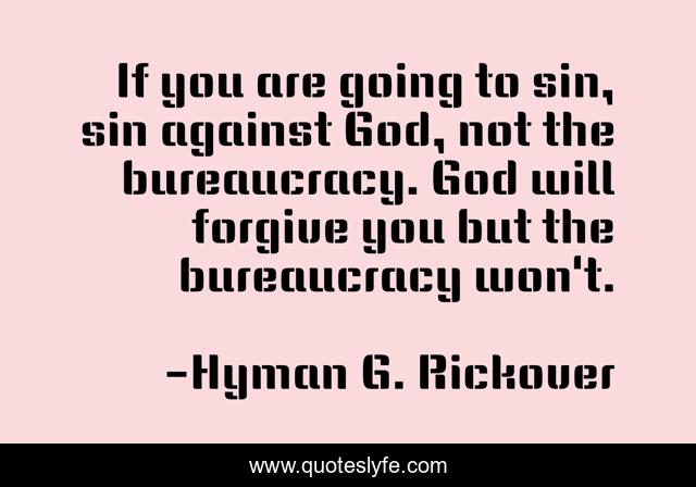 This page presents the quote "If you are going to sin, sin against God, not the bureaucracy. God will forgive you but the bureaucracy won't.". Author of this quote is Hyman G. Rickover. This quote is about bureaucracy, sin,.
