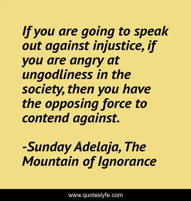 This page presents the quote "If you are going to speak out against injustice, if you are angry at ungodliness in the society, then you have the opposing force to contend against.". Author of this quote is Sunday Adelaja, The Mountain of Ignorance. This quote is about mountain, life, force, darkness, power, danger, speak-out, god, people,.
