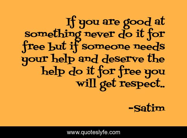 This page presents the quote "If you are good at something never do it for free but if someone needs your help and deserve the help do it for free you will get respect..". Author of this quote is Satim. This quote is about peace-making, help, peace, inspirational, helping-others, enthusiasm,.