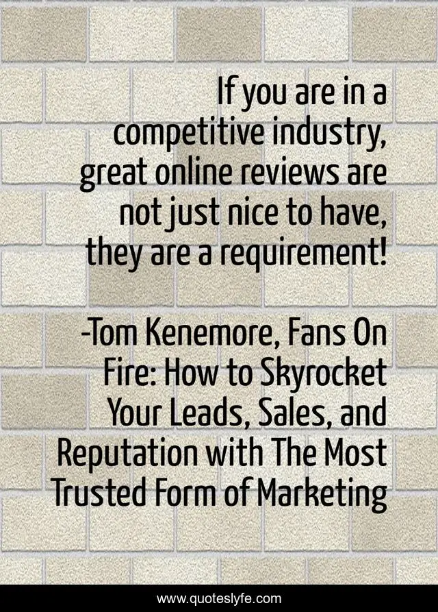 This page presents the quote "If you are in a competitive industry, great online reviews are not just nice to have, they are a requirement!". Author of this quote is Tom Kenemore, Fans On Fire: How to Skyrocket Your Leads, Sales, and Reputation with The Most Trusted Form of Marketing. This quote is about online-reputation-management, google, yelp, business, marketing, facebook, reputation-management, angie-s-list,.