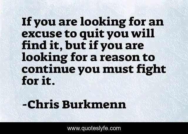 This page presents the quote "If you are looking for an excuse to quit you will find it, but if you are looking for a reason to continue you must fight for it.". Author of this quote is Chris Burkmenn. This quote is about faith, god, work, jesus, live, dreams, believe, achieve, goals,.