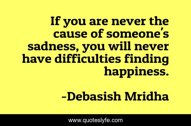 This page presents the quote "If you are never the cause of someone's sadness, you will never have difficulties finding happiness.". Author of this quote is Debasish Mridha. This quote is about life, love, knowledge, inspirational, intelligence, philosophy, wisdom, sadness, difficulties,.