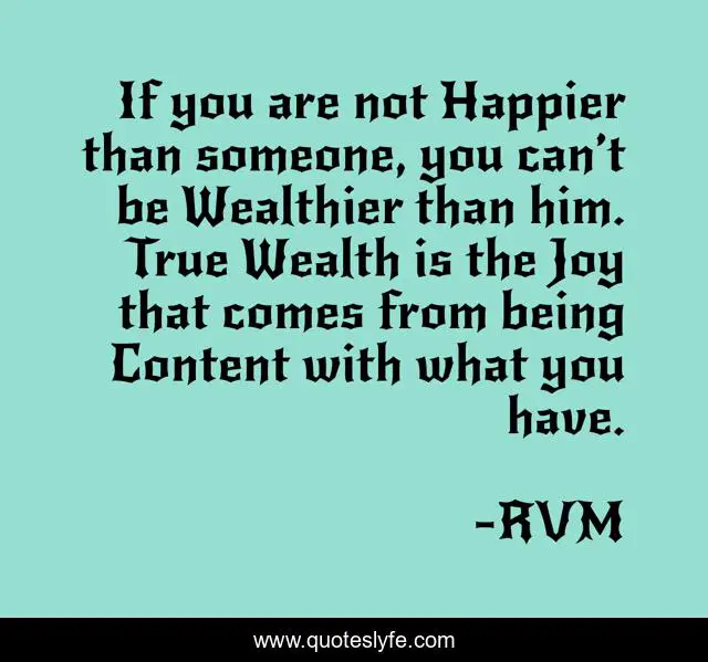 This page presents the quote "If you are not Happier than someone, you can’t be Wealthier than him. True Wealth is the Joy that comes from being Content with what you have.". Author of this quote is RVM. This quote is about motivation, inspiration,.