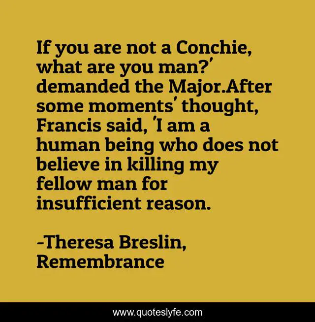 This page presents the quote "If you are not a Conchie, what are you man?' demanded the Major.After some moments' thought, Francis said, 'I am a human being who does not believe in killing my fellow man for insufficient reason.". Author of this quote is Theresa Breslin, Remembrance. This quote is about conchie, ww1, war, conscientious-objector,.