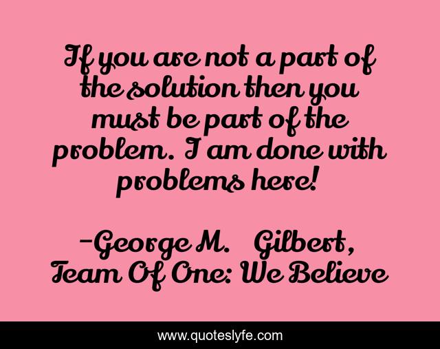 This page presents the quote "If you are not a part of the solution then you must be part of the problem. I am done with problems here!". Author of this quote is George M. Gilbert, Team Of One: We Believe. This quote is about team-direction, confidence, football, success, positive, motivational, winning, coaching, optimistic,.