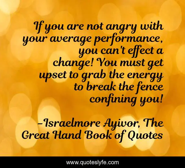 This page presents the quote "If you are not angry with your average performance, you can't effect a change! You must get upset to grab the energy to break the fence confining you!". Author of this quote is Israelmore Ayivor, The Great Hand Book of Quotes. This quote is about break-the-fence, energy, comfort-zone, food-for-thought, perform, angry, excel, israelmore-ayivor, confine,.