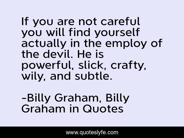 This page presents the quote "If you are not careful you will find yourself actually in the employ of the devil. He is powerful, slick, crafty, wily, and subtle.". Author of this quote is Billy Graham, Billy Graham in Quotes. This quote is about devil, satan, billy-graham,.