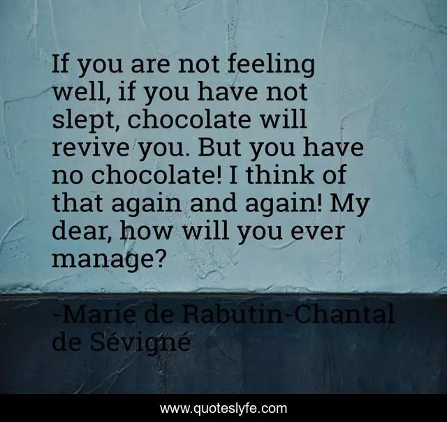 This page presents the quote "If you are not feeling well, if you have not slept, chocolate will revive you. But you have no chocolate! I think of that again and again! My dear, how will you ever manage?". Author of this quote is Marie de Rabutin-Chantal de Sévigné. This quote is about dessert, humour,.