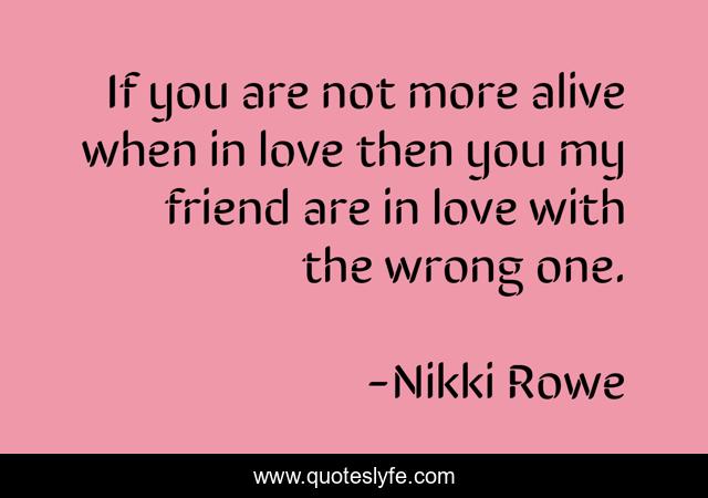 This page presents the quote "If you are not more alive when in love then you my friend are in love with the wrong one.". Author of this quote is Nikki Rowe. This quote is about true-love, lovers, love, synchronicty, twin-flame-love, soul, connection, connection-with-people, serendipity,.