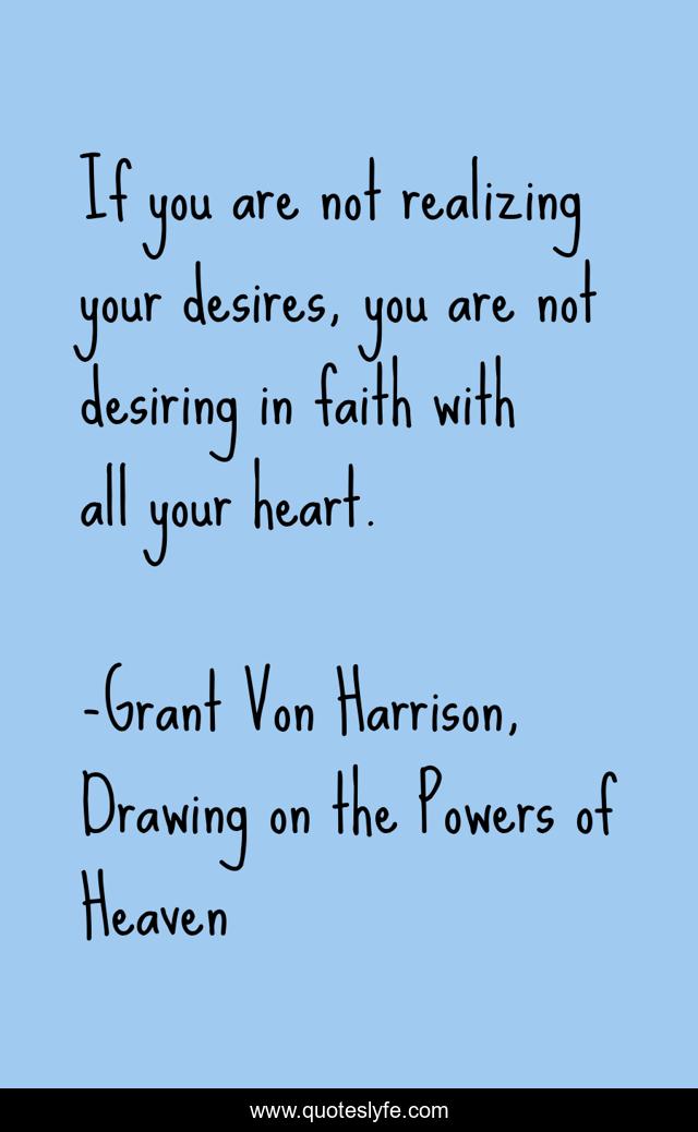 This page presents the quote "If you are not realizing your desires, you are not desiring in faith with all your heart.". Author of this quote is Grant Von Harrison, Drawing on the Powers of Heaven. This quote is about faith, prayer,.