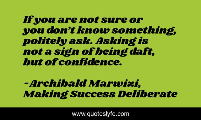 This page presents the quote "If you are not sure or you don’t know something, politely ask. Asking is not a sign of being daft, but of confidence.". Author of this quote is Archibald Marwizi, Making Success Deliberate. This quote is about life, success, behaviour, attitude, legacy, growth, purpose, inspirational, leadership,.