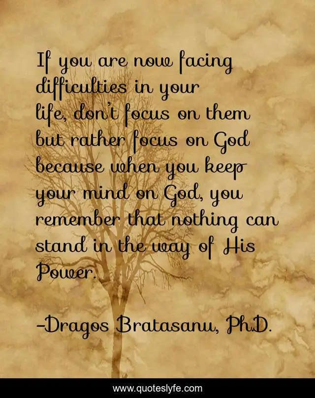 This page presents the quote "If you are now facing difficulties in your life, don’t focus on them but rather focus on God because when you keep your mind on God, you remember that nothing can stand in the way of His Power.". Author of this quote is Dragos Bratasanu, Ph.D.. This quote is about faith, god, focus, wisdom, difficulties-of-life, problems-in-life,.
