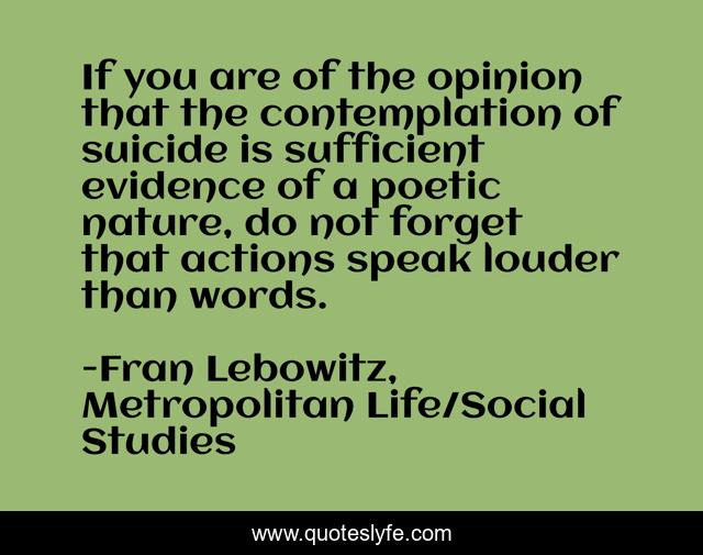 This page presents the quote "If you are of the opinion that the contemplation of suicide is sufficient evidence of a poetic nature, do not forget that actions speak louder than words.". Author of this quote is Fran Lebowitz, Metropolitan Life/Social Studies. This quote is about humor, poetry,.