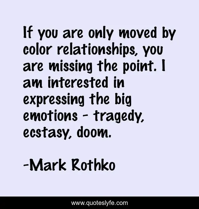 This page presents the quote "If you are only moved by color relationships, you are missing the point. I am interested in expressing the big emotions - tragedy, ecstasy, doom.". Author of this quote is Mark Rothko. This quote is about art, color-relationships, paintings, emotionality-of-art,.