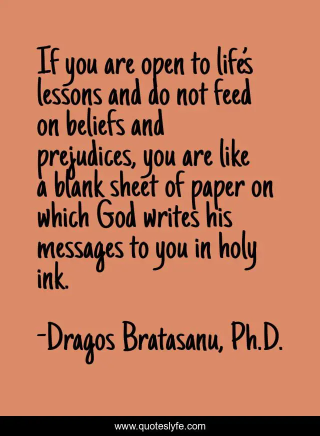 This page presents the quote "If you are open to life’s lessons and do not feed on beliefs and prejudices, you are like a blank sheet of paper on which God writes his messages to you in holy ink.". Author of this quote is Dragos Bratasanu, Ph.D.. This quote is about faith, life, education, love, god, wisdom, life-lessons, trust, beliefs,.