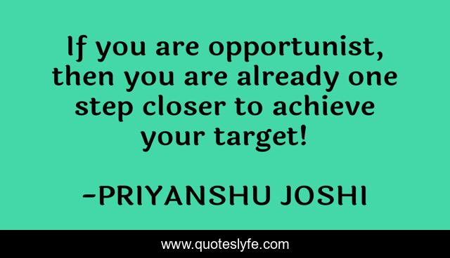 This page presents the quote "If you are opportunist, then you are already one step closer to achieve your target!". Author of this quote is PRIYANSHU JOSHI. This quote is about confidence, business, aim-high, positive, motivational, opportunities, positive-thinking, optimistic, inspirational,.