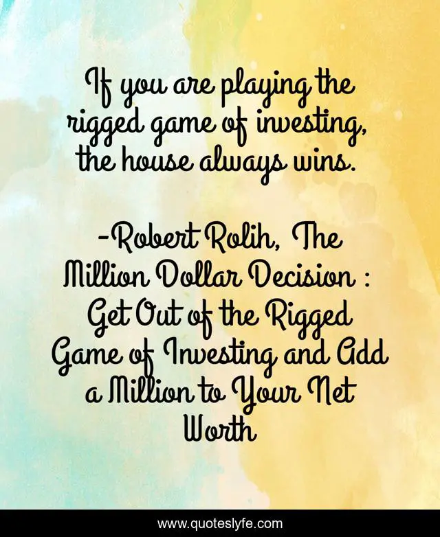 This page presents the quote "If you are playing the rigged game of investing, the house always wins.". Author of this quote is Robert Rolih, The Million Dollar Decision : Get Out of the Rigged Game of Investing and Add a Million to Your Net Worth. This quote is about investing, advisers, wealth-creation,.