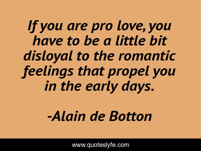This page presents the quote "If you are pro love, you have to be a little bit disloyal to the romantic feelings that propel you in the early days.". Author of this quote is Alain de Botton. This quote is about love, affection, feelings,.