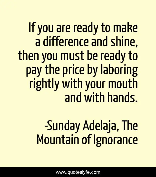 This page presents the quote "If you are ready to make a difference and shine, then you must be ready to pay the price by laboring rightly with your mouth and with hands.". Author of this quote is Sunday Adelaja, The Mountain of Ignorance. This quote is about shine, mountain, life, darkness, power, danger, god, price, people,.