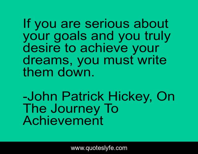 This page presents the quote "If you are serious about your goals and you truly desire to achieve your dreams, you must write them down.". Author of this quote is John Patrick Hickey, On The Journey To Achievement. This quote is about personal-development, achievement, goal-setting, success, goals,.