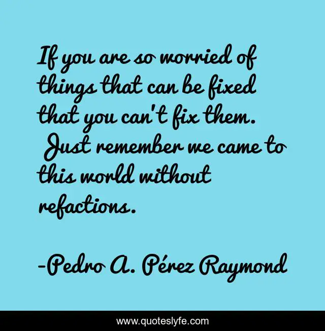 This page presents the quote "If you are so worried of things that can be fixed that you can't fix them. Just remember we came to this world without refactions.". Author of this quote is Pedro A. Pérez Raymond. This quote is about reflexions, life, encouragement,.