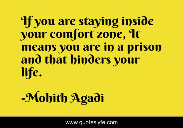 This page presents the quote "If you are staying inside your comfort zone, It means you are in a prison and that hinders your life.". Author of this quote is Mohith Agadi. This quote is about life, quote, motivational, motivation, quotes, optimistic, positive, quotes-by-mohith, confidence,.