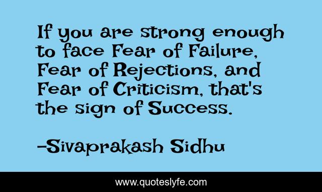 This page presents the quote "If you are strong enough to face Fear of Failure, Fear of Rejections, and Fear of Criticism, that's the sign of Success.". Author of this quote is Sivaprakash Sidhu. This quote is about successful-living, success,.