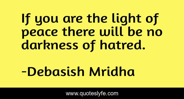 This page presents the quote "If you are the light of peace there will be no darkness of hatred.". Author of this quote is Debasish Mridha. This quote is about life, love, knowledge, inspirational, intelligence, philosophy, wisdom, quotes, affection,.