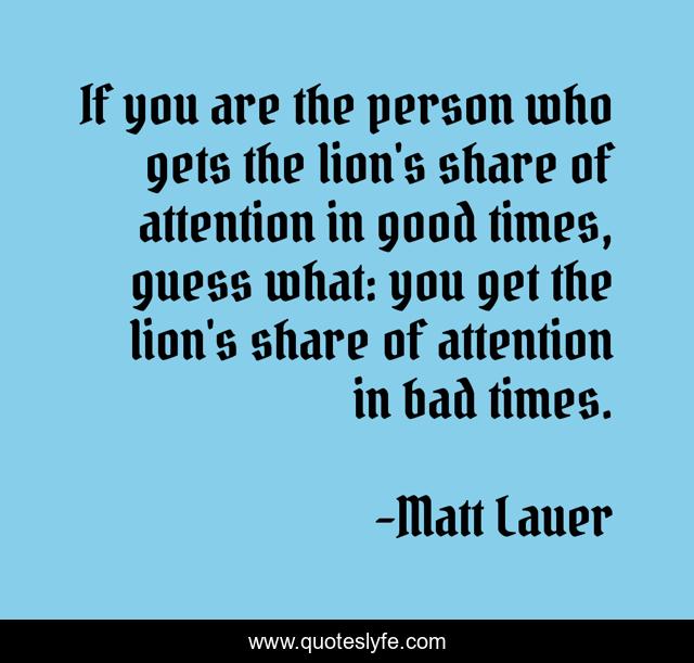This page presents the quote "If you are the person who gets the lion's share of attention in good times, guess what: you get the lion's share of attention in bad times.". Author of this quote is Matt Lauer. This quote is about lion, good times,.