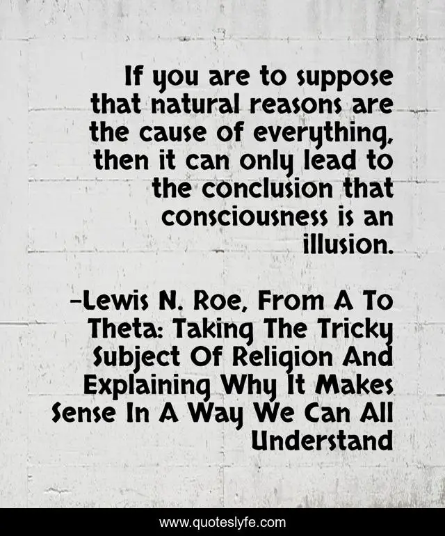 This page presents the quote "If you are to suppose that natural reasons are the cause of everything, then it can only lead to the conclusion that consciousness is an illusion.". Author of this quote is Lewis N. Roe, From A To Theta: Taking The Tricky Subject Of Religion And Explaining Why It Makes Sense In A Way We Can All Understand. This quote is about consciousness, naturalism,.