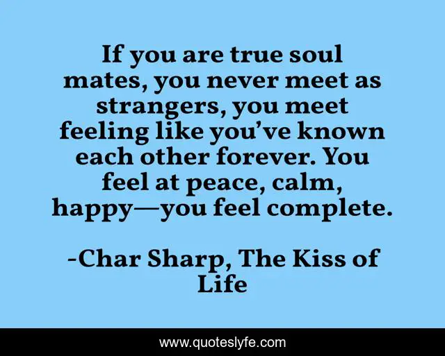 This page presents the quote "If you are true soul mates, you never meet as strangers, you meet feeling like you’ve known each other forever. You feel at peace, calm, happy—you feel complete.". Author of this quote is Char Sharp, The Kiss of Life. .