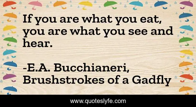 This page presents the quote "If you are what you eat, you are what you see and hear.". Author of this quote is E.A. Bucchianeri, Brushstrokes of a Gadfly. This quote is about senses, proverbial-wisdom, wise-sayings, influence, gadfly, wisdom, environment, senses-of-the-the-soul, experiences,.