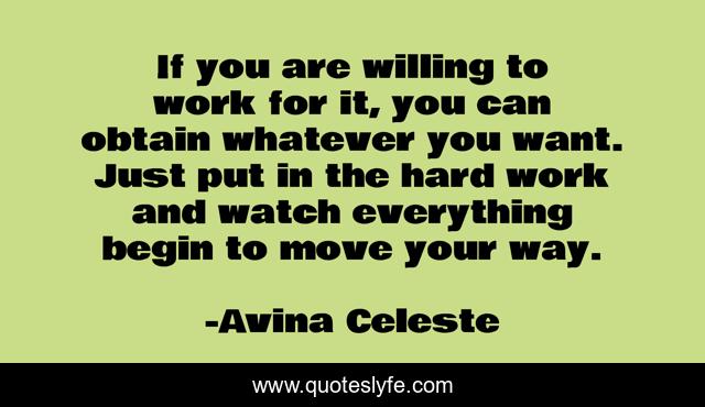 This page presents the quote "If you are willing to work for it, you can obtain whatever you want. Just put in the hard work and watch everything begin to move your way.". Author of this quote is Avina Celeste. This quote is about confidence, motivational, success, positive, work, optimistic, inspirational, enthusiasm,.