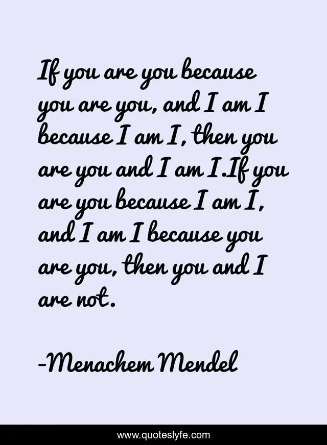 This page presents the quote "If you are you because you are you, and I am I because I am I, then you are you and I am I.If you are you because I am I, and I am I because you are you, then you and I are not.". Author of this quote is Menachem Mendel. This quote is about i, identities, truth,.