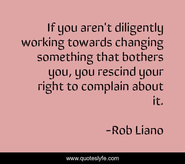 This page presents the quote "If you aren't diligently working towards changing something that bothers you, you rescind your right to complain about it.". Author of this quote is Rob Liano. This quote is about personal-development, complaint, accountability, personal-growth,.