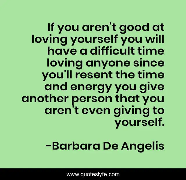 This page presents the quote "If you aren't good at loving yourself you will have a difficult time loving anyone since you'll resent the time and energy you give another person that you aren't even giving to yourself.". Author of this quote is Barbara De Angelis. .
