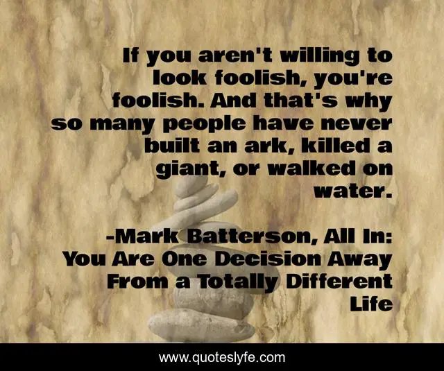 This page presents the quote "If you aren't willing to look foolish, you're foolish. And that's why so many people have never built an ark, killed a giant, or walked on water.". Author of this quote is Mark Batterson, All In: You Are One Decision Away From a Totally Different Life. This quote is about foolish, achievement, success, wisdom,.