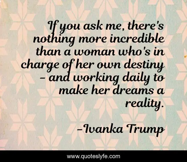 This page presents the quote "If you ask me, there's nothing more incredible than a woman who's in charge of her own destiny - and working daily to make her dreams a reality.". Author of this quote is Ivanka Trump. This quote is about woman, daily, reality,.