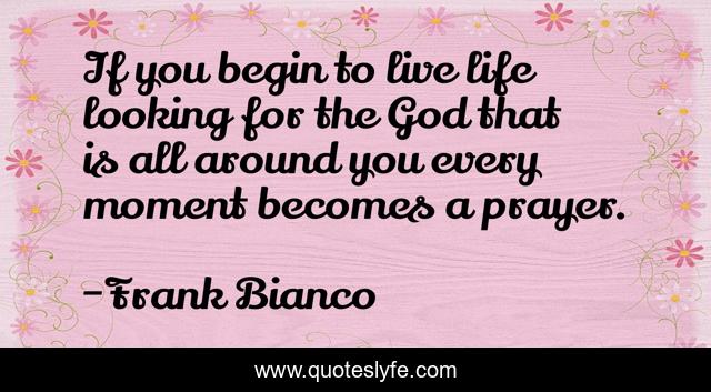 This page presents the quote "If you begin to live life looking for the God that is all around you every moment becomes a prayer.". Author of this quote is Frank Bianco. .