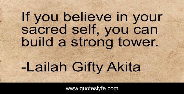 This page presents the quote "If you believe in your sacred self, you can build a strong tower.". Author of this quote is Lailah Gifty Akita. This quote is about life, self-confidence, believe-in-yourself, motivational, confidence, optimistic, self-help, positive,.