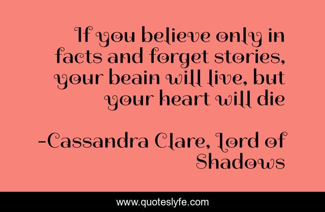 This page presents the quote "If you believe only in facts and forget stories, your beain will live, but your heart will die". Author of this quote is Cassandra Clare, Lord of Shadows. This quote is about facts, heart, stories,.