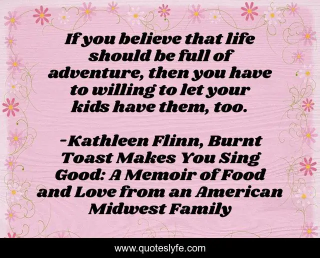 This page presents the quote "If you believe that life should be full of adventure, then you have to willing to let your kids have them, too.". Author of this quote is Kathleen Flinn, Burnt Toast Makes You Sing Good: A Memoir of Food and Love from an American Midwest Family. This quote is about kids, midwest, adventure,.