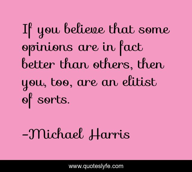 This page presents the quote "If you believe that some opinions are in fact better than others, then you, too, are an elitist of sorts.". Author of this quote is Michael Harris. This quote is about opinion, life, elitism,.
