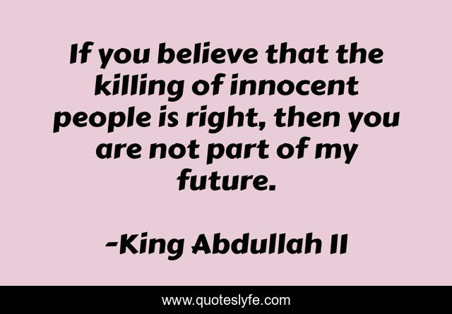 This page presents the quote "If you believe that the killing of innocent people is right, then you are not part of my future.". Author of this quote is King Abdullah II. This quote is about future, innocence-lost, killing,.