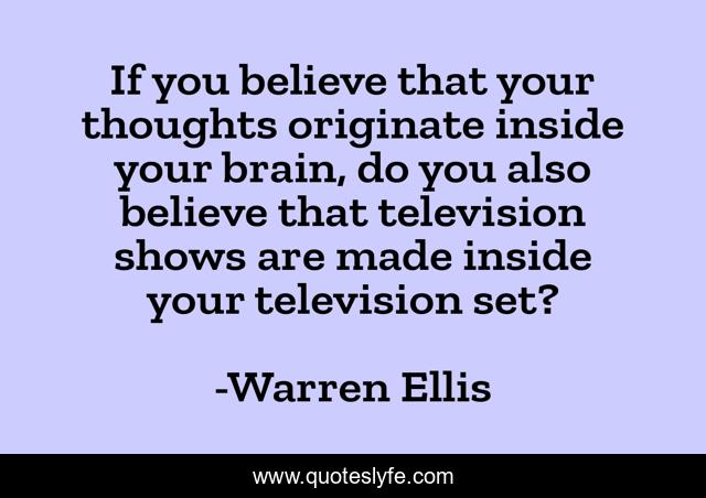 This page presents the quote "If you believe that your thoughts originate inside your brain, do you also believe that television shows are made inside your television set?". Author of this quote is Warren Ellis. This quote is about television, thinking, media, influence, responsibility, representations,.
