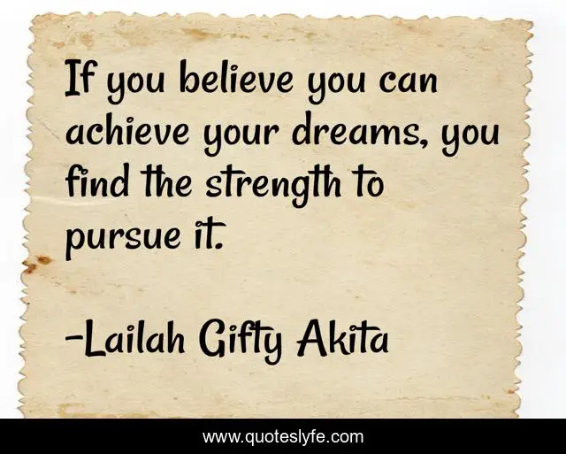 This page presents the quote "If you believe you can achieve your dreams, you find the strength to pursue it.". Author of this quote is Lailah Gifty Akita. This quote is about confidence, strength, positive, motivational, optimistic, believe, dreams, never-give-up,.